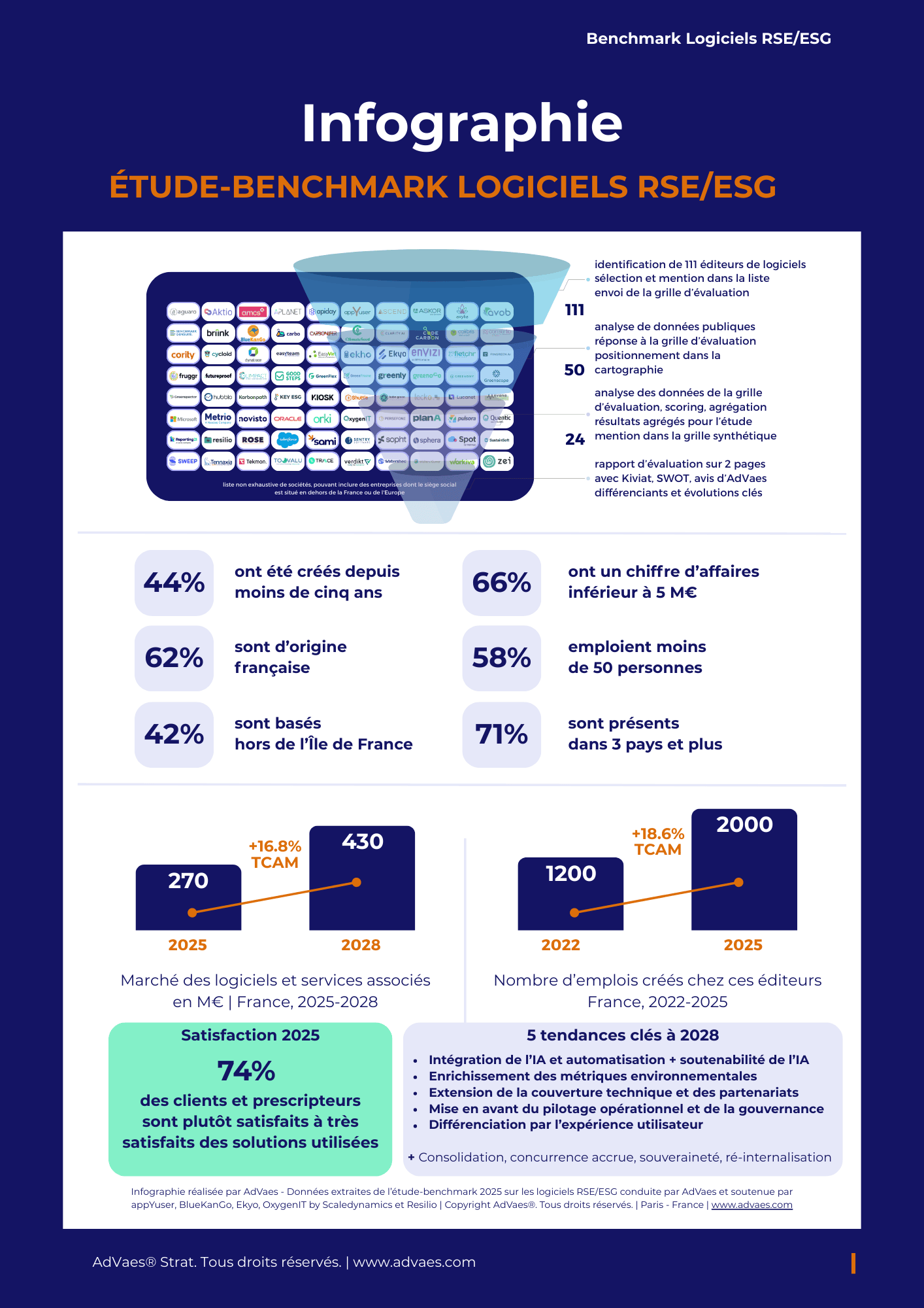 AdVaes publie son étude-benchmark des logiciels RSE/ESG, un rapport de plus de 100 pages qui dresse un état des lieux complet de plus de 110 éditeurs de software RSE/ESG, délivre les résultats d'une enquête de satisfaction auprès de 60 C-Levels, et décrypte les tendances clés d’un marché en pleine évolution.